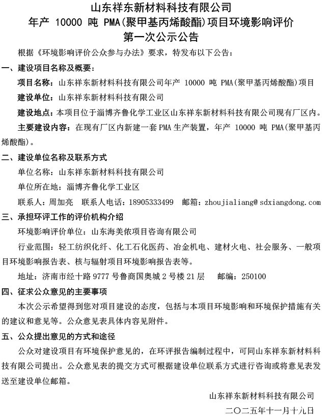 年产10000吨PMA(聚甲基丙烯酸酯)项目环境影响评价