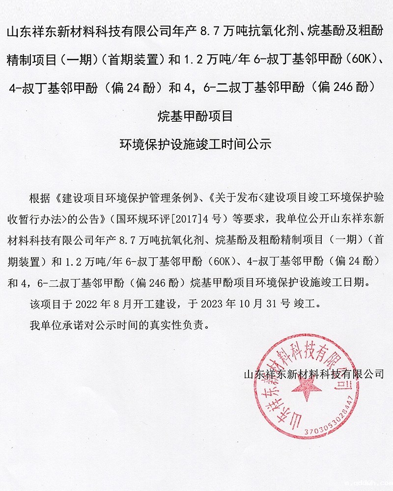 烷基甲酚项目环境保护设施竣工时间公示